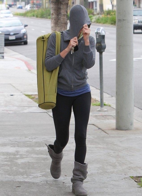 В среду 37-летнию актрису заметили в Лос-Анджелесе, когда она покидала класс йоги. Она пыталась полностью закрыться от папарацци при помощи своего капюшона на кофте.