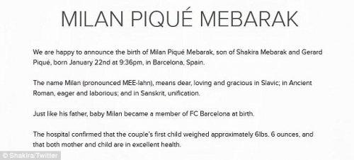 В целом в ее сообщении говорится: «Мы рады объявить о рождении Милана Пике Мебарак, сына Шакиры Мебарак и Жерара Пике, который родился 22 января в 9:36 вечера в Барселоне, Испания. Имя Милан (произносится Мее-Лан), означает дорогой, любящий и милостивый. Милан пошел по стопам своего отца и стал членом ФК Барселона. В госпитале сказали, что первый сын родился здоровым и весил при рождении 6 фунтов 6 унций». По сообщениям, мама и ребенок чувствуют себя превосходно.