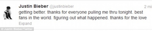 Джастин в твиттере поблагодарил своих поклонников:«Мне лучше. Спасибо всем кто беспокоился за меня ночью. Лучшие фанаты в мире. Выясняем, что произошло. Спасибо за любовь ».
