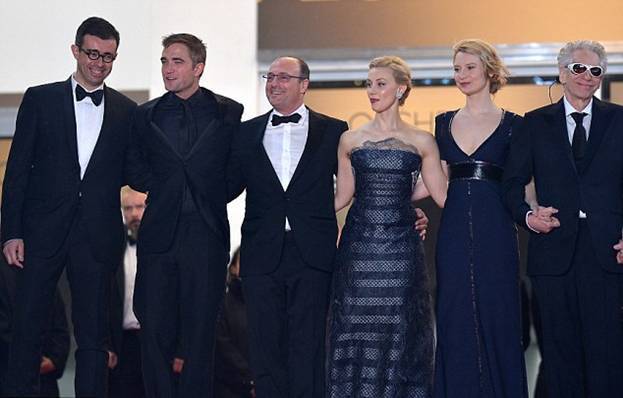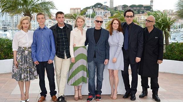 Роберт Паттинсон и Миа Васиковска с коллегами по фильму "Звездная карта" на фотосессии в Каннах