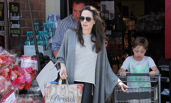 Анджелина Джоли со своим сыном Ноксом была замечена в лос-анджелесском  продуктовом магазине Bristol Farms. Пару сопровождал телохранитель, который помогал нести покупки.