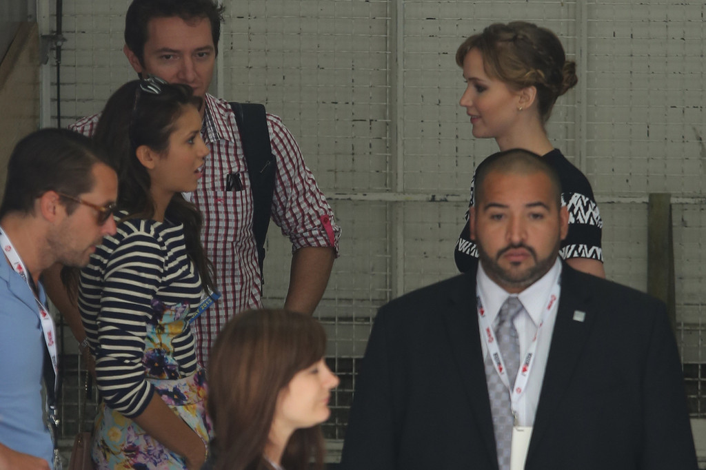 Нина Дибров и Дженнифер лоуренс встретились в пресс-центре, Йен Сомерхолдер (в правом углу) зашел в пресс-центр и сразу вышел