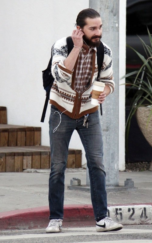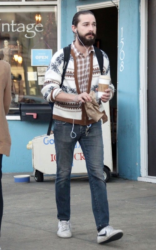 25-летнего актера Шайя ЛаБеф трудно узнать с бородой и зачесанными в небольшой хвостик волосами.