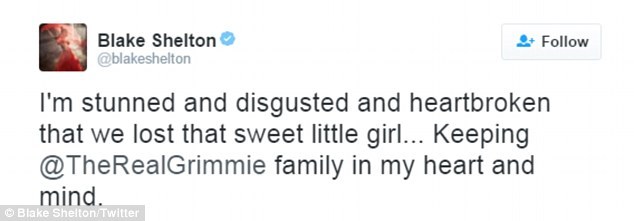 "Я шокирован и убит горем ведь мы потеряли нашу милую маленькую девочку...Я с семьей Гримми и сердцем и душой", - написал Блейк Шелтон.