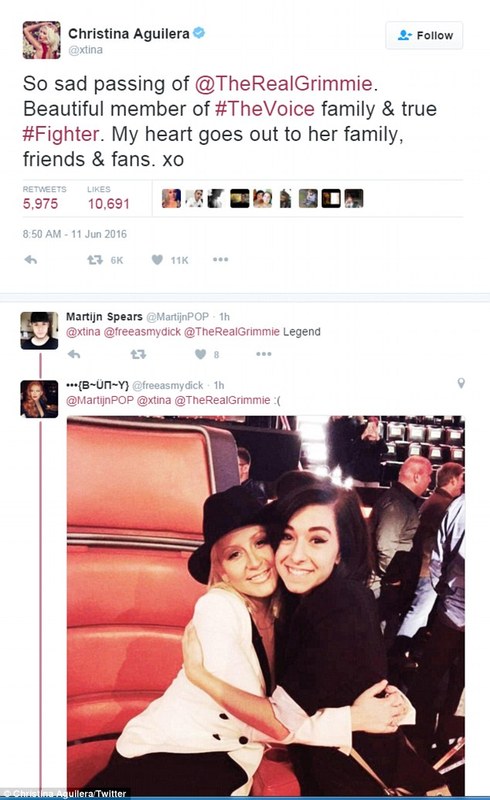 "Так грустно, что Гримми умерла. Прекрасный член семьи "Голоса", и настоящий Боец. Я всем сердцем с её семьей и фанатами. Целую", - оставила пост скроби Кристина Агилера.