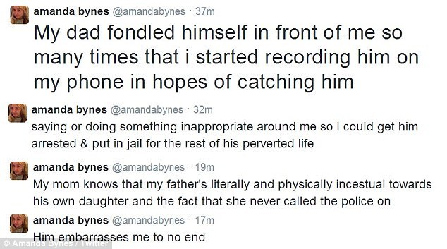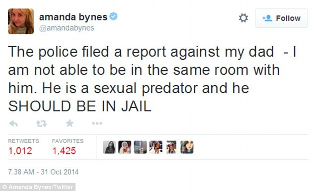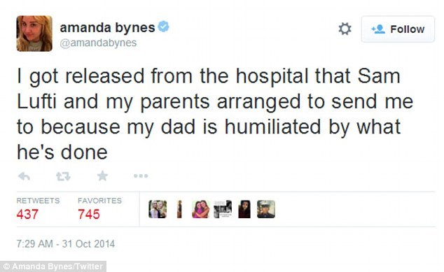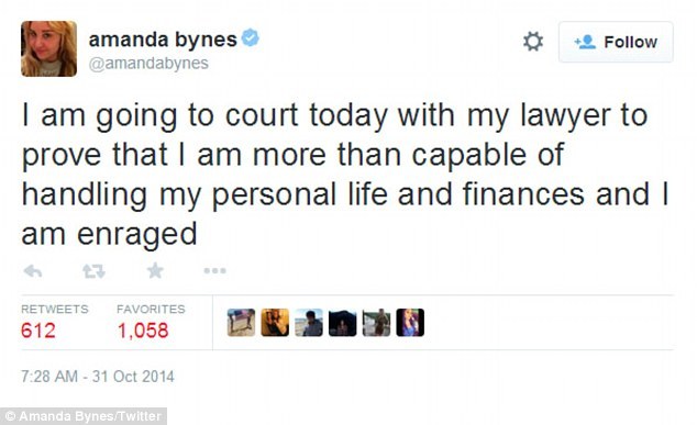 Между тем менее чем через 24 часа после своей выписки, она возобновила свои сообщения в твиттере, чтобы пообщаться со своими подписчиками. Она написала целую обличительную речь в сети: "Я собираюсь сегодня в суд с моим адвокатом, чтобы доказать, что более, чем способна заботится о себе и своих финансах, и я в ярости на своих родителей". "Я была выписана из больницы, куда меня насильно отправили родители, потому что мой отец считает себя оскорбленным. Мои родители хотят снова взять надо мной опеку, чтобы распоряжаться моими финансами. Не выйдет. Я подала рапорт в полицию против отца. Я не в состоянии быть с ним в одной комнате, он сексуальный хищник и должен быть в СИЗО".