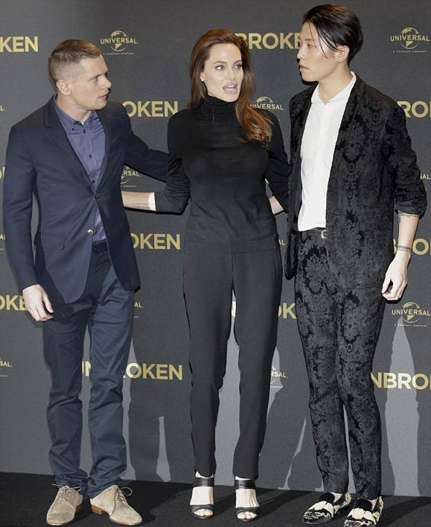 Анджелина с актерами фильма Джеком О'Коннелл и Мияви