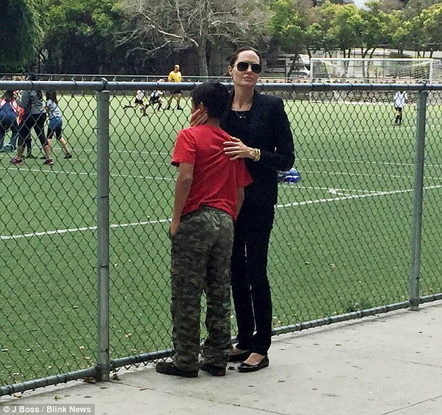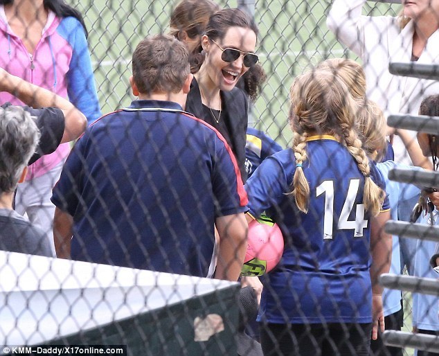 Лауреат премии Оскар вместе с сыновьями Паксом и Ноксом были в рядах болельщиков, когда 8-летняя Шайло и 10-летняя Захара вышли на поле для победы в футбольном матче в Лос-Анджелесе, штат Калифорния, в субботу.