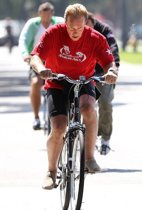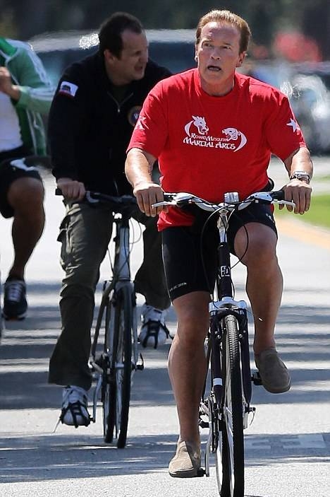 Обычно Арнольда Шварценеггера можно увидеть за рулем Harley-Davidson и Хаммера, но вчера немолодой актер решил сменить свой вид транспорта в пользу здорового. В субботу утром, звезду Голливуда заметили за рулем велосипеда.