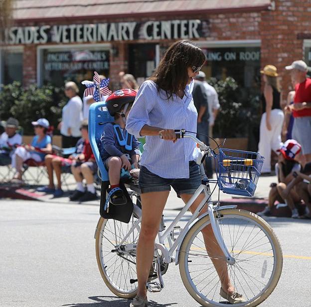 а Дженнифер проехала на велосипеде вдоль праздничного шествия.