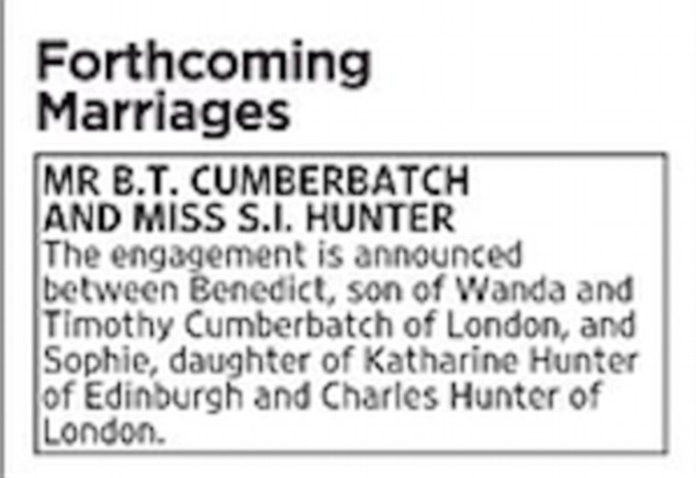Как сообщается, на этих выходных актер прилетел в Эдинбург, чтобы по всем правилам просить у матери Софи Кэтрин ее руки. В понедельник в The Times было опубликовано официальное объявление о помолвке, в котором говорится: "Г-н Камбербэтч и мисс С.Хантер объявляют помолвку между Бенедиктом, сыном Ванды и Тимоти Кабербэтч из Лондона, и Софи, дочери Кэтрин Хантер из Эдинбурга и Чарльза Хантер из Лондона".