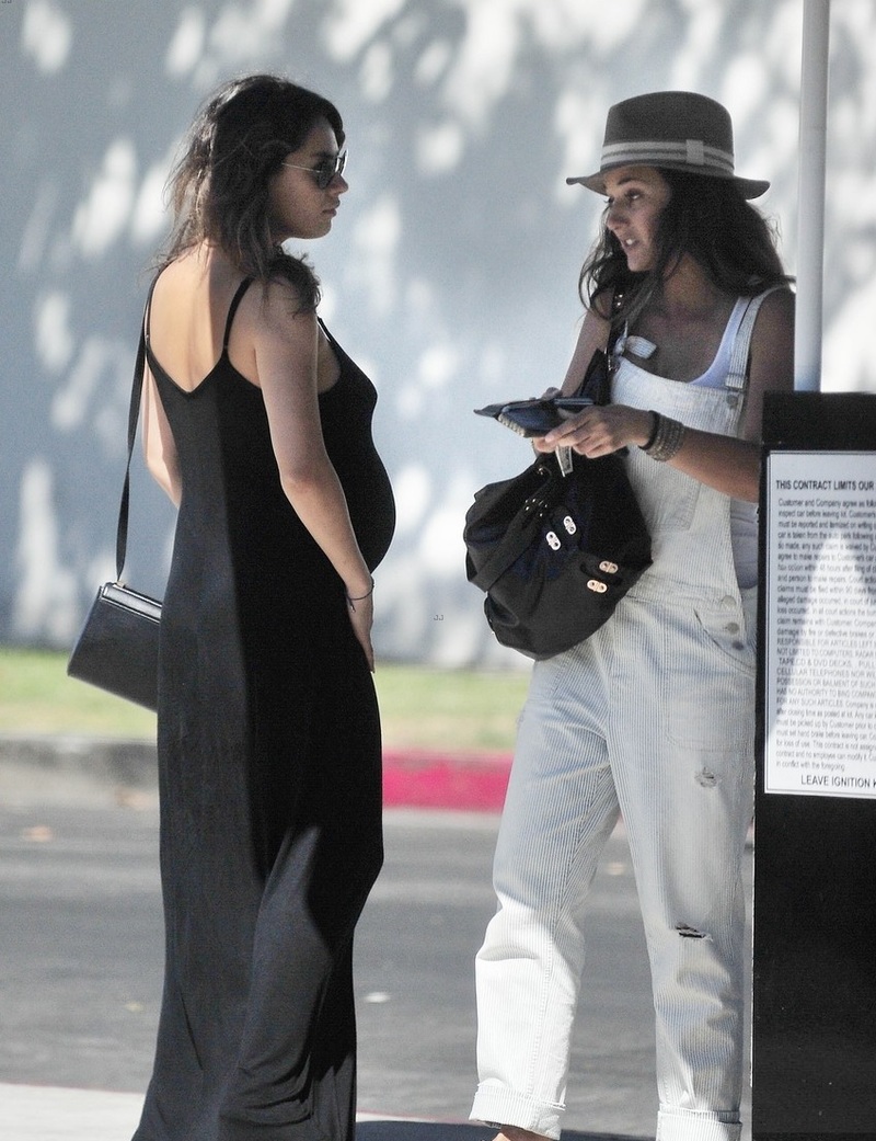 Мила Кунис хвастается ее растущим животиком в облегающем черном платье во время обеденной прогулки с подругой в воскресенье днем, 10 августа, в Лос-Анджелесе.