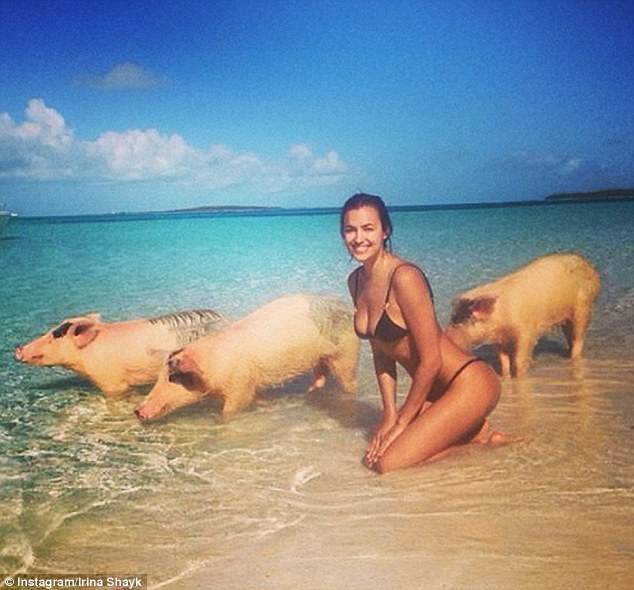 Дельфины, тюлени и рыбы - обычные дружеские обитатели океана, но Ирина Шейк не ищет легких путей и предпочла им компанию прижившихся на острове свиней.