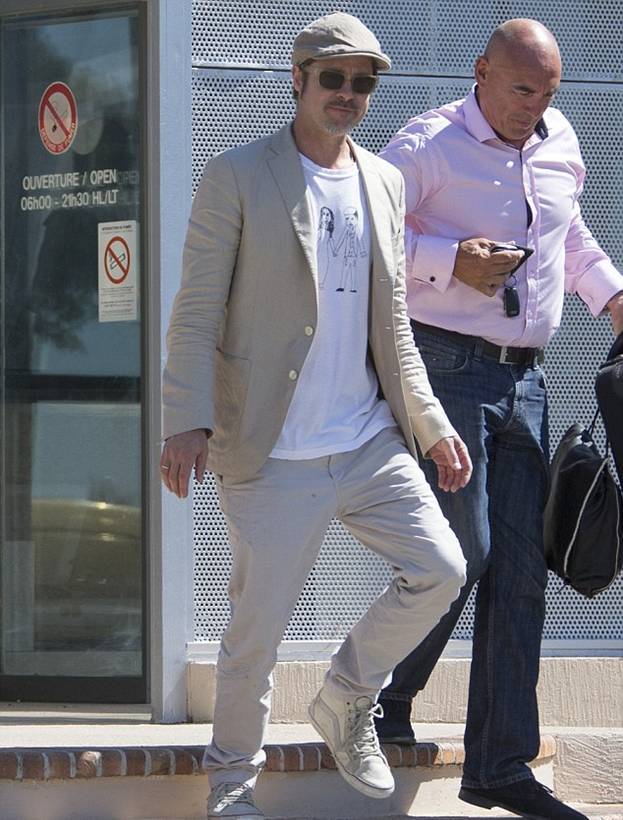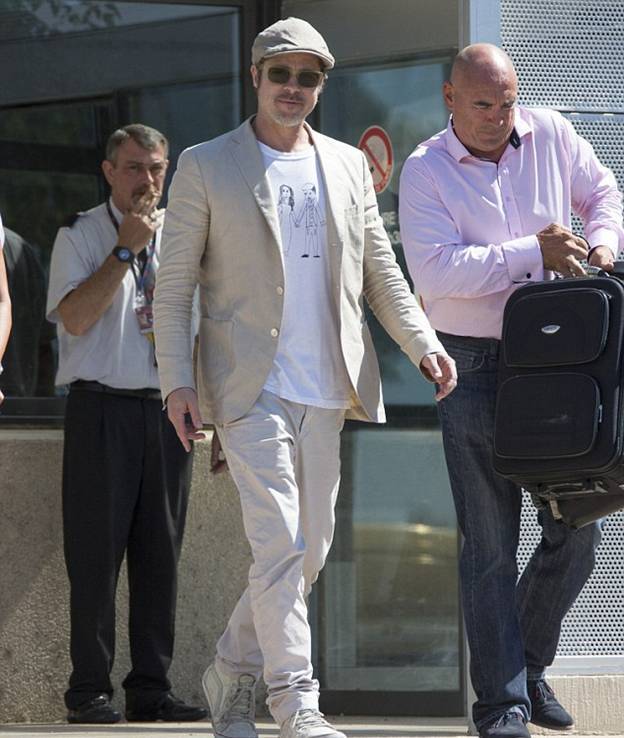 В четверг днем Брэд Питт приземлился на юге Франции, он был замечен в аэропорту Марсель Прованс. Что интересно, в дорогу актер решил одеть футболку, на которой изображен он с Анджелиной Джоли.