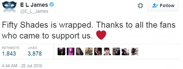 "Съемки на "На пятьдесят оттенков темнее" завершились! Спасибо всем фанам, которые пришли поддержать нас", - написала в Твиттере английская писательница, автор эротических романов, Эрика Леонард Джеймс.