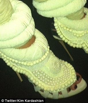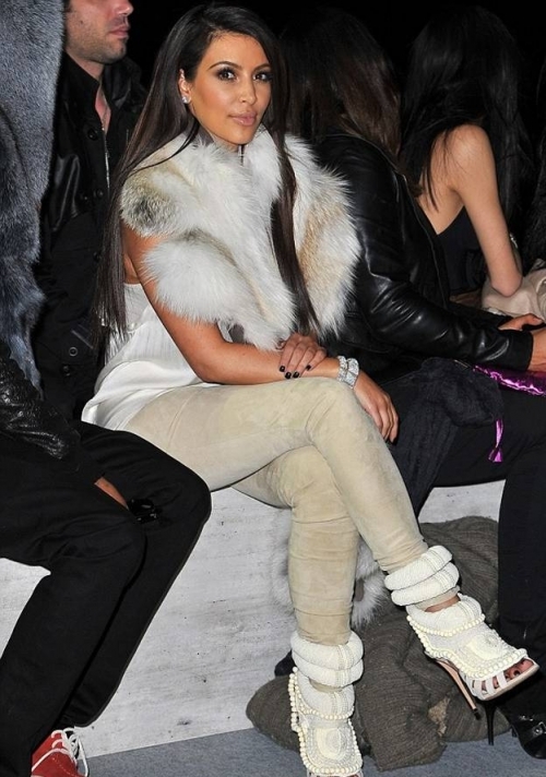 На шоу Канье Ким одела натуральный мех и обувь за $ 6,000, которая как похвасталась Кардашян в твиттере: «сделана из телячьей кожи и обшита натуральным жемчугом». Правда насколько такая обувь практична и удобна она умолчала.