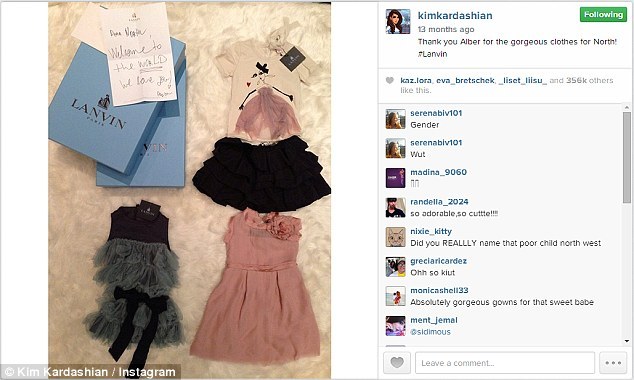 Ким обожает выкладывать в сети для своих друзей фотографии, на которых хвастается приобретенными вещами для малышки. Согласно источникам, годовалая девочка имеет более 200 дизайнерских вещей, многие из которых были присланы ей бесплатно в виде подарков от Модных домов. "Ким и Канье благодарны, когда дизайнеры присылают им одежду для дочери", - рассказал инсайдер журналистам. И это помимо того, что у Норт есть личный портной.