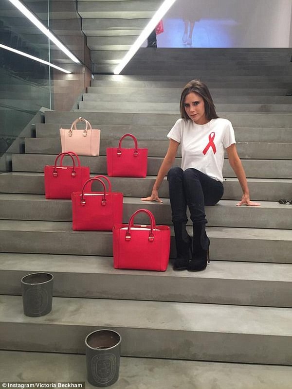 Виктория на ступеньках своего магазина в футболке от Виктории Бекхэм