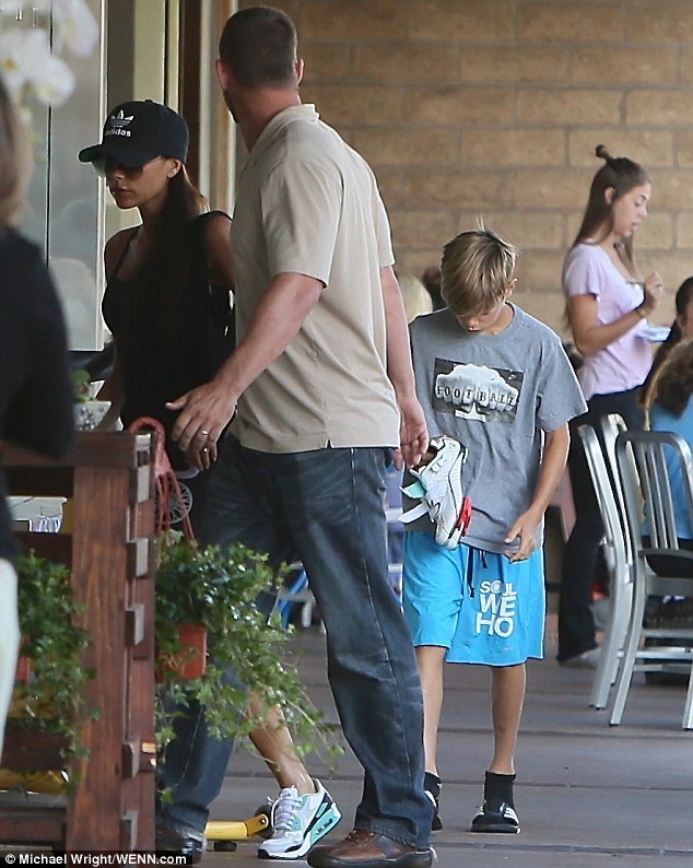 Его жена Виктория, шла рядом с их 12-летним сыном Ромео, в сопровождении семейного телохранителя.