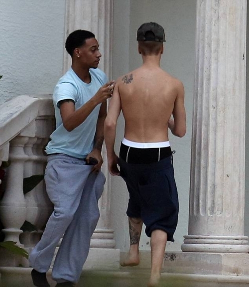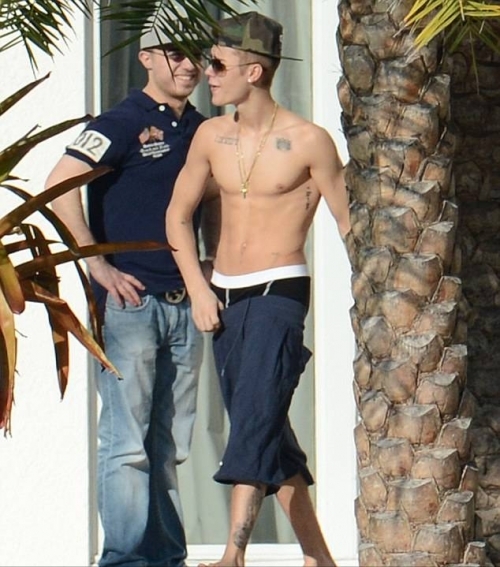 О его манере терять штаны по дороге, не писал только ленивый. Джастин и в этот раз побаловал нас своим нижним бельем, разнообразив свой вид голым торсом.
