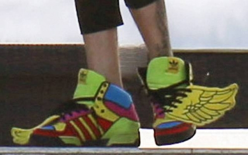 Так, певец был замечен в «очаровательных» черно-белых штанишках, обутый в не менее привлекающий взгляд яркие кроссовки с крылышками.