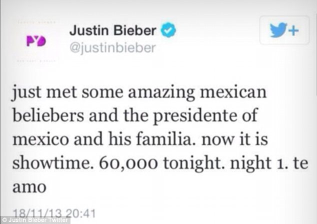 Например, дружеская встреча с президентом Мексики и его семьей. Так в понедельник на своем твиттере он написал для миллионов своих фанатов, что имел удивительную возможность, встретится с мексиканскими Beliebers, среди которых был президент Мексики и его семья.