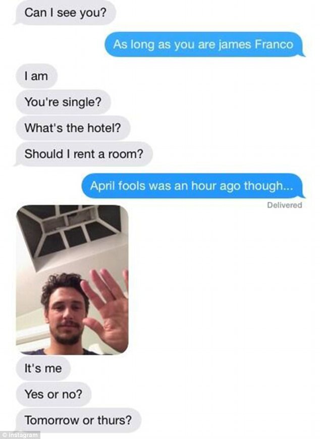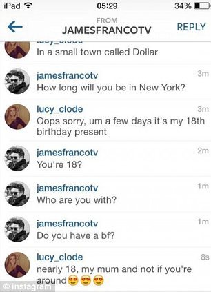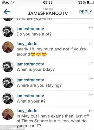 Джеймс это увидел и крикнул, что она обязана выложить фотографии в Instagram, обозначив их его именем. Позже он нашел эти фотографии и завел с девушкой любопытный разговор. Актера интересовало откуда она, есть ли у нее бойфренд, есть ли ей уже 18 лет. На что Люси честно ответила, что приехала из Шотландии с мамой, остановилась в отеле. Джеймс сразу же поинтересовался, что за отель и может ли он снять там комнату. Девушка растерялась от такой прыти 35-летнего мужчины, быстро сказав, что ей нет еще 18 и им лучше встретиться попозже, когда она прилетит в США одна и совершеннолетняя.