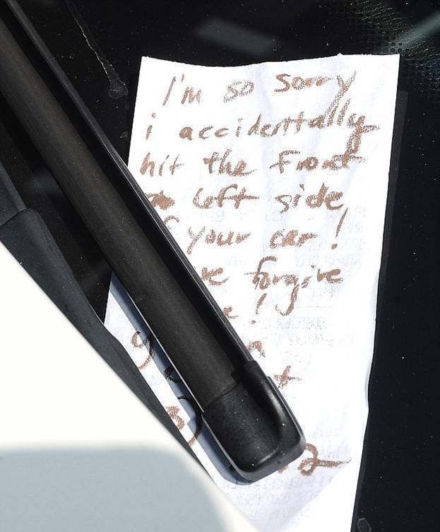 После чего, взяв свою губную помаду, она написала довольно милую записку водителю пострадавшей машины: "Я так сожалею, что случайно стукнула переднюю сторону вашей машины! Пожалуйста, прости меня!", дописав в углу свое имя и номер телефона.