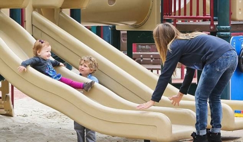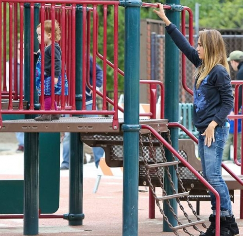Пока старшая дочь актрисы Онор игралась с другими детьми, Джессика занималась своей годовалой дочерью Хевен. Она показывала на своем примере, как нужно съезжать по детской горке и, что при этом нечего бояться.