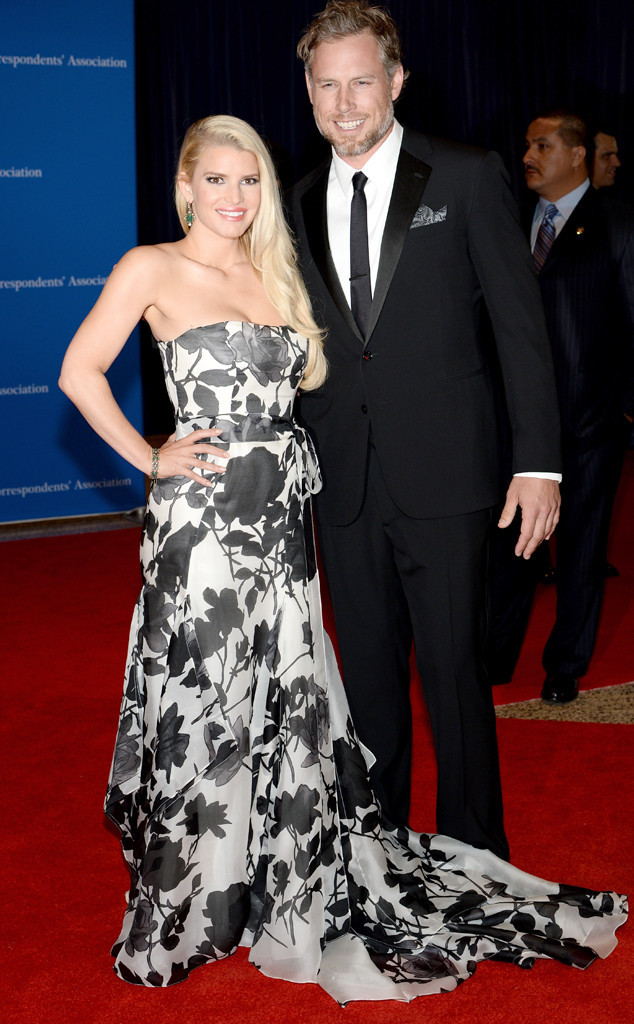 Джессика продемонстрировала тонкую талию в цветастом платье от Каролины Эрреры, которое она дополнила серьгами и браслетом от Neil Lane. Эрик был одет в костюм от Ralph Lauren и весь вечер не отходил от своей будущей жены.