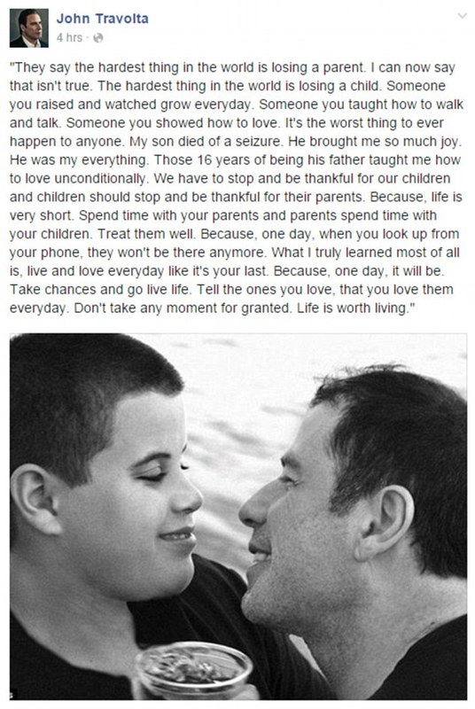 "Многие говорят, что самое трудное время, это когда теряешь своих родителей. Теперь я могу сказать, что это не так. Самое трудное терять своих детей. Того, за кем вы наблюдали каждый день. Кого научили ходить и говорить, кому показали, как любить...Он был всем для меня ", написал Джон. Далее он советует семьям: "Мы должны быть благодарны нашим детям, а дети должны быть благодарны родителям. Проводите больше времени друг с другом, любите друг друга. В один прекрасный день, кто-то может уйти от нас. Жизнь очень коротка".