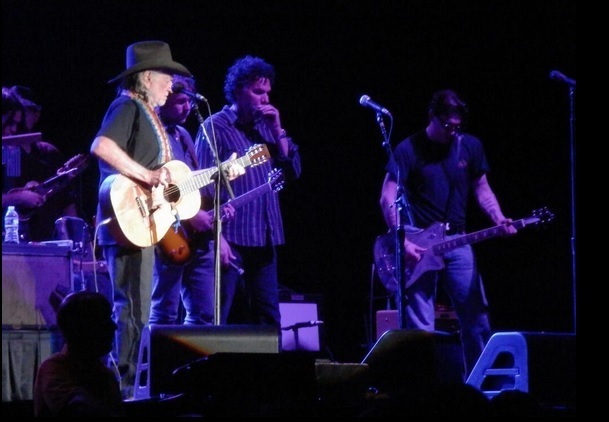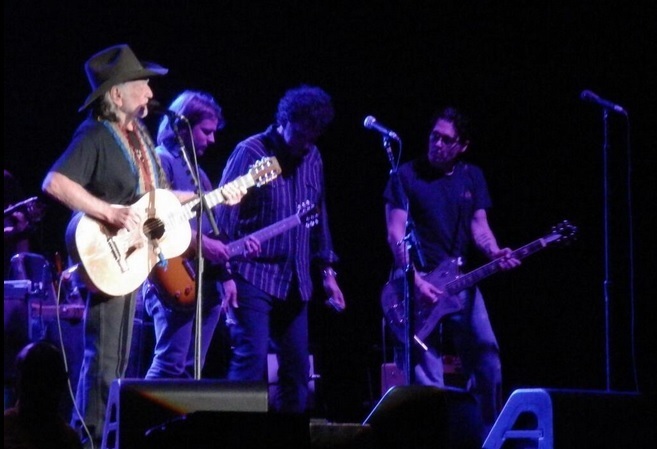 Актер играл на гитаре во время всего выступления Вилли Нельсона в зале Blue Bank Hills в Бостоне на прошлой неделе.