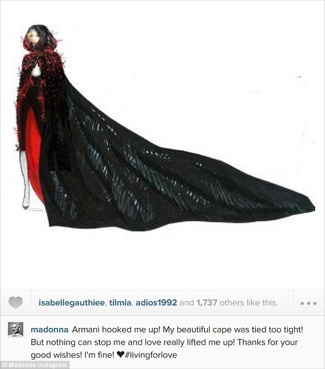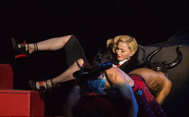 Между тем сама Мадонна, рассказывая об инциденте, поделилась: "Я боялась, что мой плащ во время выступления будет соскальзывать с меня, он слишком тяжелый. Поэтому его слишком крепко завязали вокруг моей шеи. У меня был выбор - быть задушенной им или упасть, я выбрала падение".