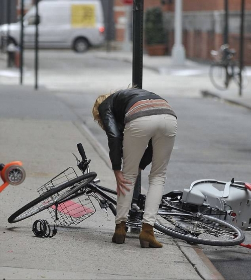 Надо заметить, что 44-летняя звезда совершила поездку почти через половину города, правда в конце пути у нее произошла маленькая авария. При попытке привязать велосипед к столбу, она его не удержала и он упал.