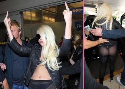 Поп-звезду встречала толпа папарацци, и она не разочаровала их, появившись полураздетой, а именно в лифчике, черной куртки и черных колготах.