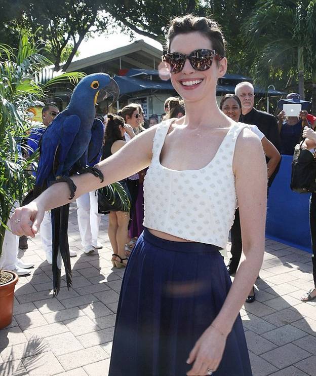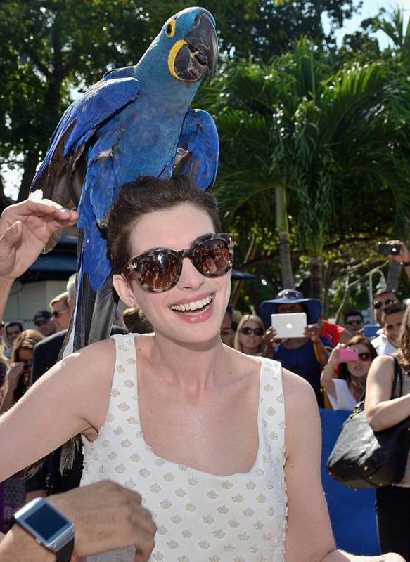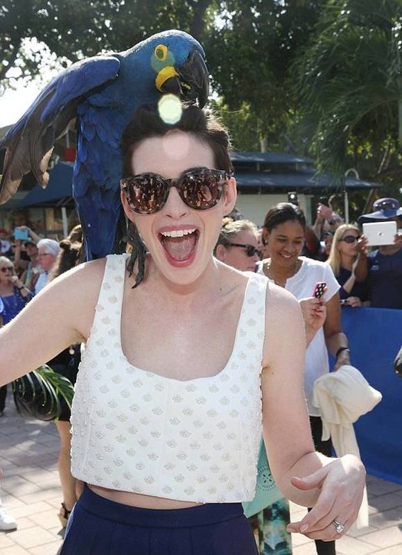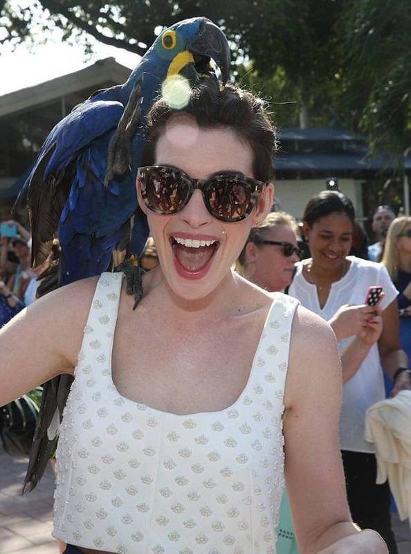 В мультипликационной франшизе Рио она озвучивает попугая Джевела, и похоже, что это не прошло бесследно, и в реальной жизни эти птички стали "чувствовать" в ней родственную душу. В пятницу во время мероприятия на Аллеи славы в Майами, Энн Хэтэуэй была "обласкана" попугаем, который в буквальном смысле не хотел отпускать актрису далеко от себя.