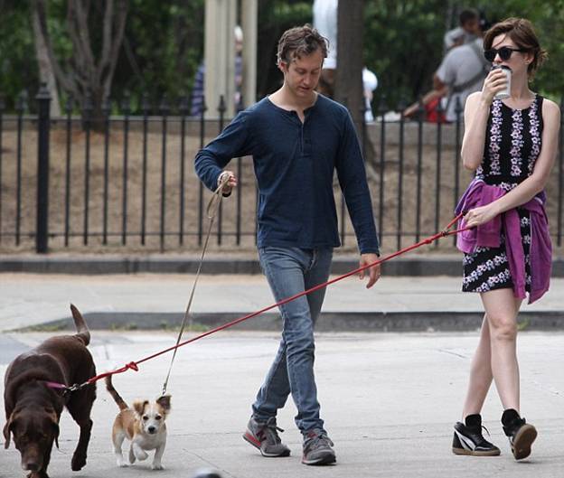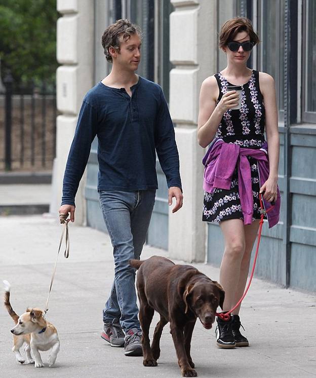 Энн Хэтэуэй и Адам Шульман на прогулке со своими питомцами