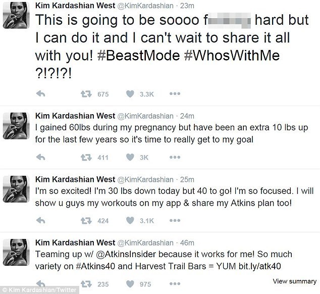 Она написала в твиттере ряд сообщений , в которых признала, что это будет очень трудно, но она постарается сделать все от нее возможное, худея в несколько этапов.
