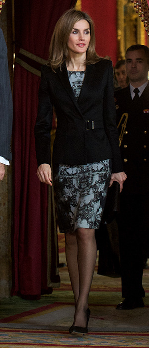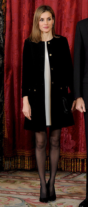 Королева Испании Летиция выбрали шикарное белое платье и дополнила образ черным пальто без воротника, когда она давала обед в честь президента Сенегала Маки Салла.