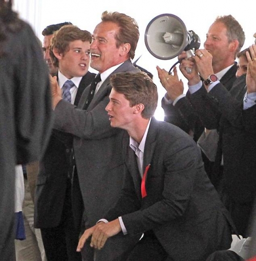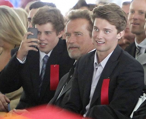 Шварценеггер сидел в первом ряду между своими сыновьями Патриком и Кристофером.