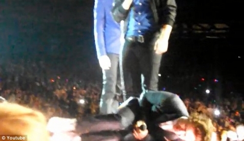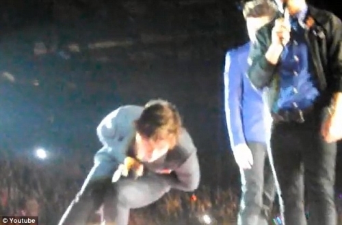Инцидент на концерте группы "One Direction": Меткий бросок и Гарри Стайлс лежит на сцене, корчась от боли (видео)