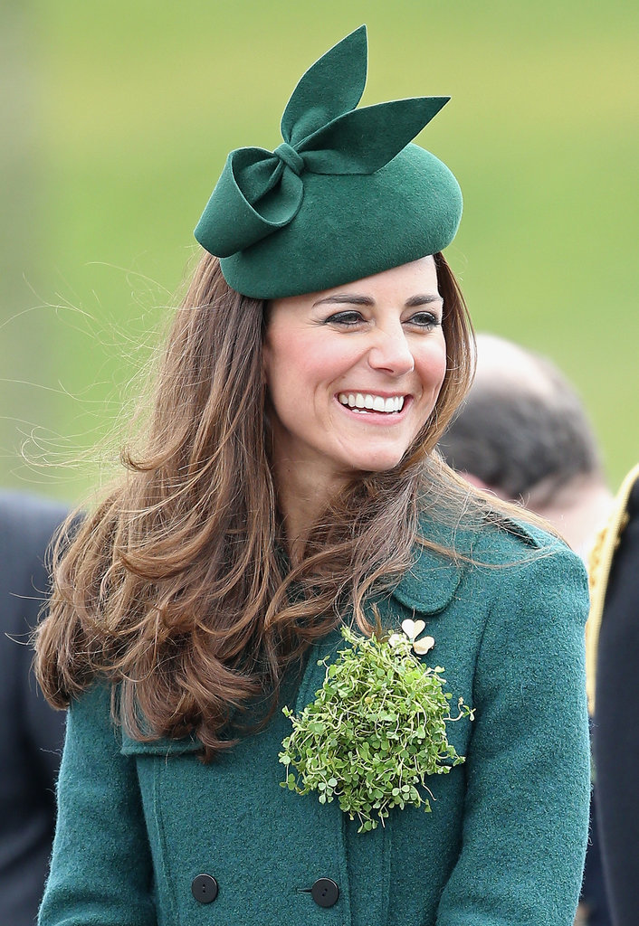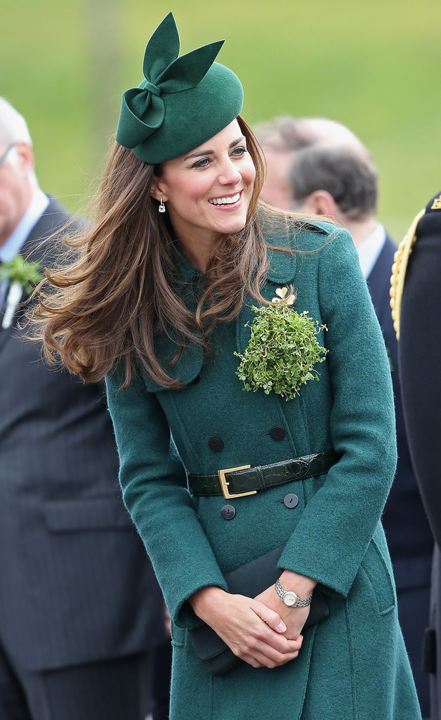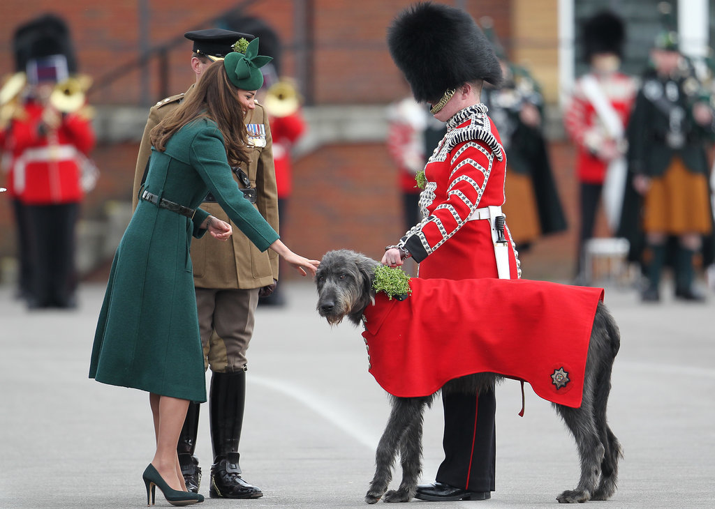 Это в третий раз, когда герцогиня Кембриджская принимала участие в подобных торжествах. В этот раз Кейт была одета в свое любимое зеленое пальто от Эмилии Викстед, которое она носила два года подряд и шляпке в тон от Джины Фостер. Внимание привлекла старинная брошь в виде трилистника, которая принадлежала еще королеве Александре, супруге короля Эдуарда VII. Герцог и герцогиня также украсили трилистниками форму охранников, в том числе - местного талисмана Ирландского волкодава, Домнала, который получил бонус в виде поглаживания по голове от Кейт.