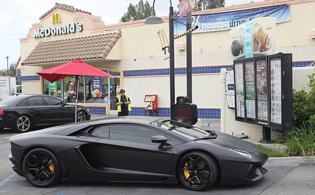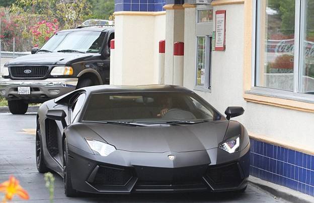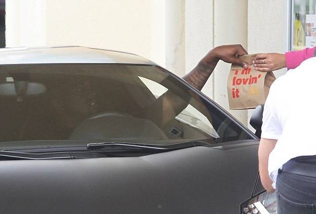 Так, в четверг он заехал в МакДональдс на своем черном Lamborghini, стоимость которого около $750 000. При этом известный своим постоянно мрачным видом певец, счастливо улыбался, беря пакет с едой в машину.