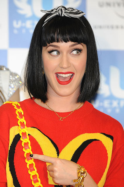 На свою пресс-конференцию, что проходила в это воскресенье в Токио, Кэти решила надеть эпатажное красное платье-свитер из последней коллекции Moschino. Дизайнеры бренда, судя по всему, по-настоящему вдохновились символикой McDonalds, особенно золотыми арками классического «М». Так, внимание привлек красовавшийся на платье и сумочке всем известный принт в виде желтой буквы «М». Дополнила образ певица обручем с черно-белым бантом и массивным золотым браслетом.