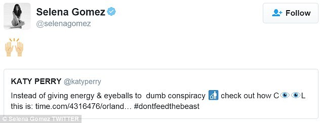 Западные СМИ успели развести Кэти Перри и Орландо Блума, приписав ему роман с Селеной Гомес из-за снимков с вечеринки, на которых близкие друзья обнимаются. Кэти, которая не комментировала ситуацию, нарушила молчание, оставив пост в Твиттере: "Вместо того, чтобы тратить свою энергию на глупые сплетни и читать всякий мусор, лучше смотрите, как это круто!". После чего последовала ссылка о деятельности Орландо в ЮНИСЕФ.