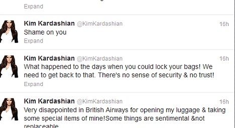 В серии твиттов она написала вчера: «Очень разочарована в British Airways, они открыли мой багаж и извлекли некоторые мои специальные предметы одежды! Некоторые очень личные». Затем видимо она обратилась к ворам: