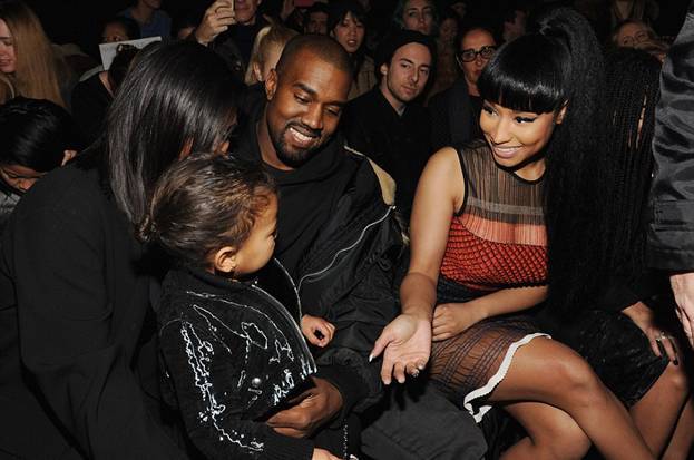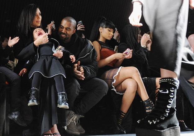 На этот раз Канье и Ким привели ее на шоу Александра Вонга. И снова малышка расплакалась во время представления. В результате чего помимо родителей ее успокаивала и сидящая рядом Ники Минаж.