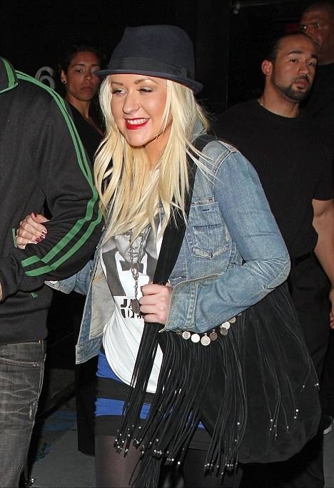В последнее время выбор гардероба у Кристины Агилеры очень сомнителен, и певица не «разочаровала» нас, когда была замечена поздно вечером в субботу в Западном Голливуде. Кристина была одета в светлую футболку, сине-черную полосатую мини-юбку, джинсовую куртку, черные плотные колготки, сапоги на каблуках.