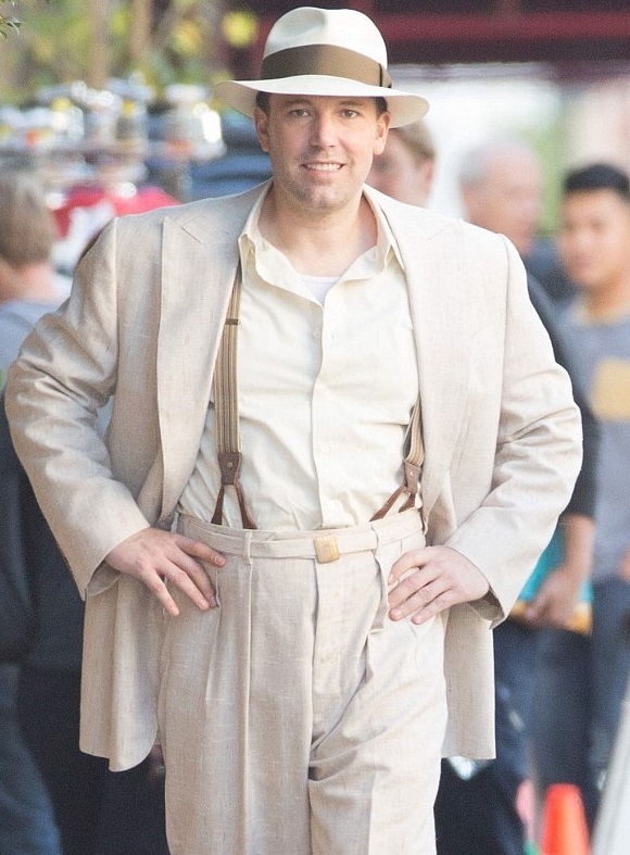 В то время Аффлек красовался в кремовом льняном костюме. Брюки с высокой талией подчеркнули стать актера, а белая рубашка, расстегнутая у шеи, отлично дополнила образ. Также на нем были коричневые ботинки и фетровая шляпа. Гангстерский стиль одежды актеров отлично имитировал моду мафиозных кругов 20-х XX века в США.