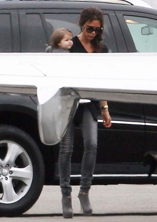 Виктория Бекхэм со своей дочерью Харпер была замечена в Ван Найс на посадке в частный самолет.